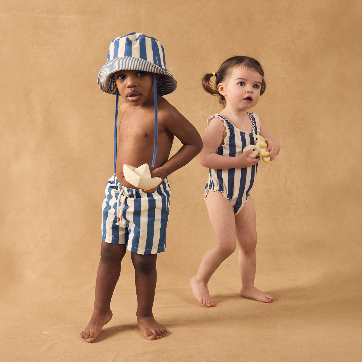uma seleção de fatos de banho e acessórios ideais para crianças dos 6 meses aos 11 anos.