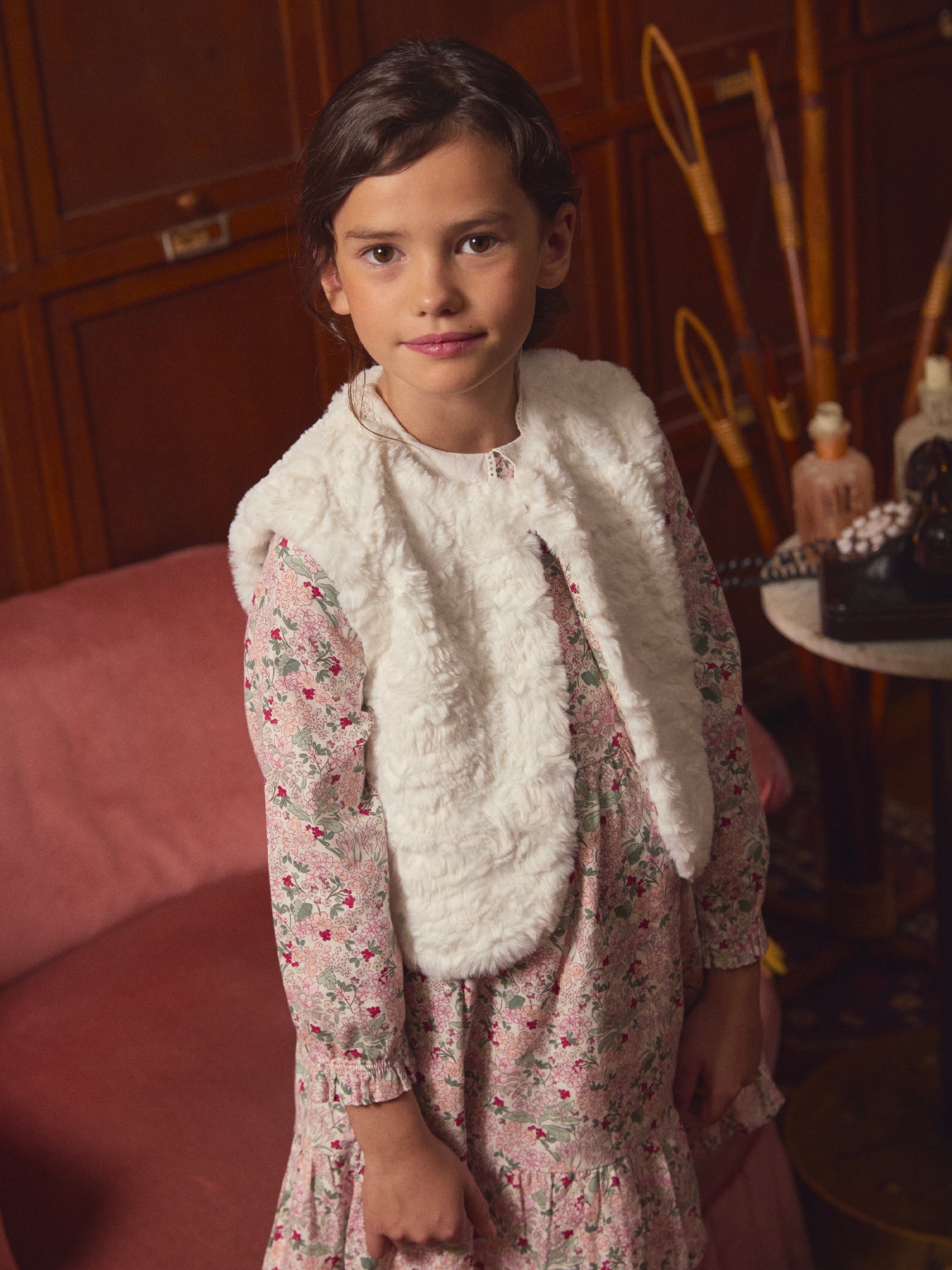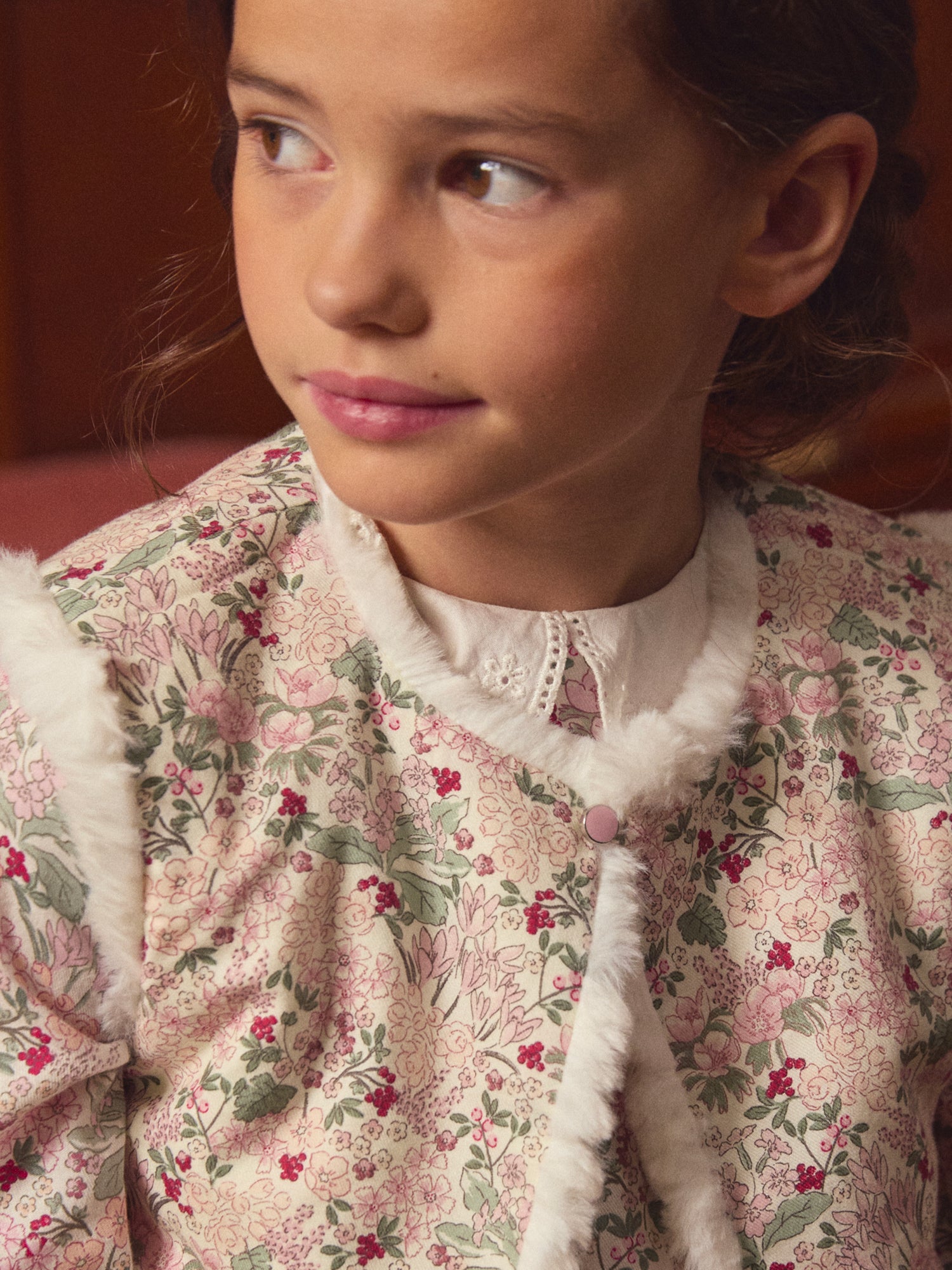 Ce gilet sans manches réversible est parfait pour réchauffer les tenues des petites aventurières. La face A offre une fourrure synthétique blanche douce, tandis que la face B présente un joli twill fleuri. Le bouton à l'avant apporte une touche pratique et élégante pour un look polyvalent.