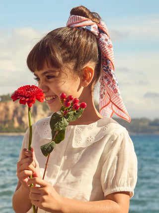 Perfeito para crianças elegantes na primavera e no verão, este cachecol leve assegura conforto. Com acabamento bordado e tecido macio. O estampado floral em vermelho e azul e a borda coral criam um estilo refinado e um universo poético.