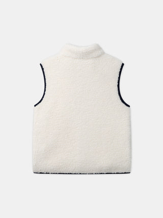 Este colete em pelo sintético é perfeito para crianças em tempo fresco. O revestimento em polar proporciona calor e conforto, ideal para dias frios. Apresenta um bolso com zipper no peito com um padrão, adicionando um toque divertido e prático. Os detalhes contrastantes em azul marinho trazem um estilo extra a esta peça casual e funcional.