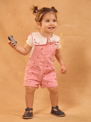 Idéale pour les bébés filles qui aiment jouer au printemps et été, cette salopette courte est confortable. En coton rayé avec bretelles ajustables et poches pratiques. Les broderies Baies et vignette « Baby 1987 » apportent style et fantaisie.